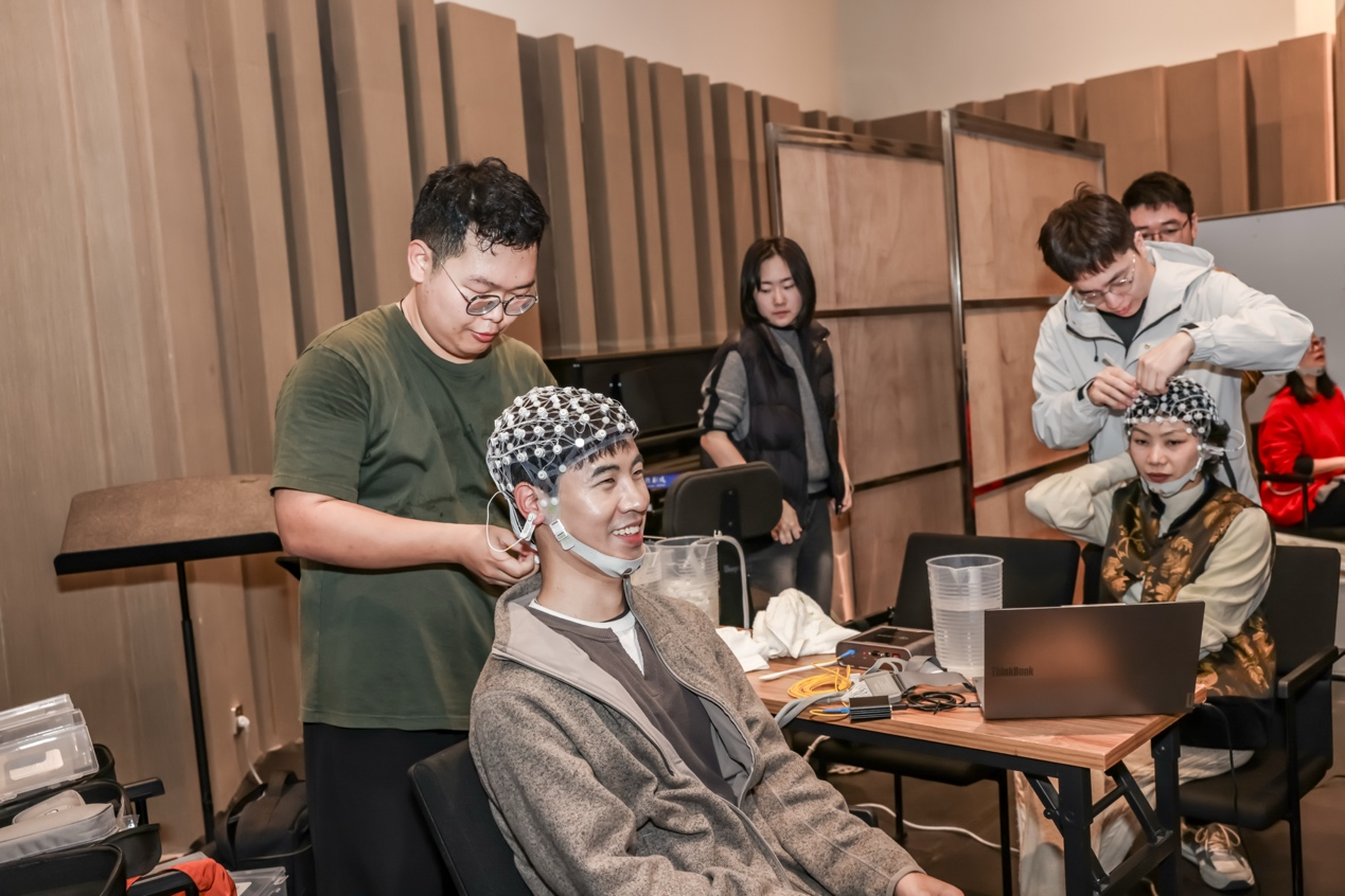 为了让与会者直观感受音乐与大脑的互动,会议设置了现场 EEG(脑电)采集实验环节。五位志愿者在佩戴脑电设备后,分别聆听了同一首“哭嫁歌”的录音版、现场人声版和 AI 改编版。大屏幕上实时滚动的脑电波形图与脑地形图,清晰展示了不同音乐形态如何激发大脑不同区域的活动,将“当声音触及大脑”这一主题从抽象概念转化为可见的数据波澜,成为连接艺术感性与科学理性的生动注脚。