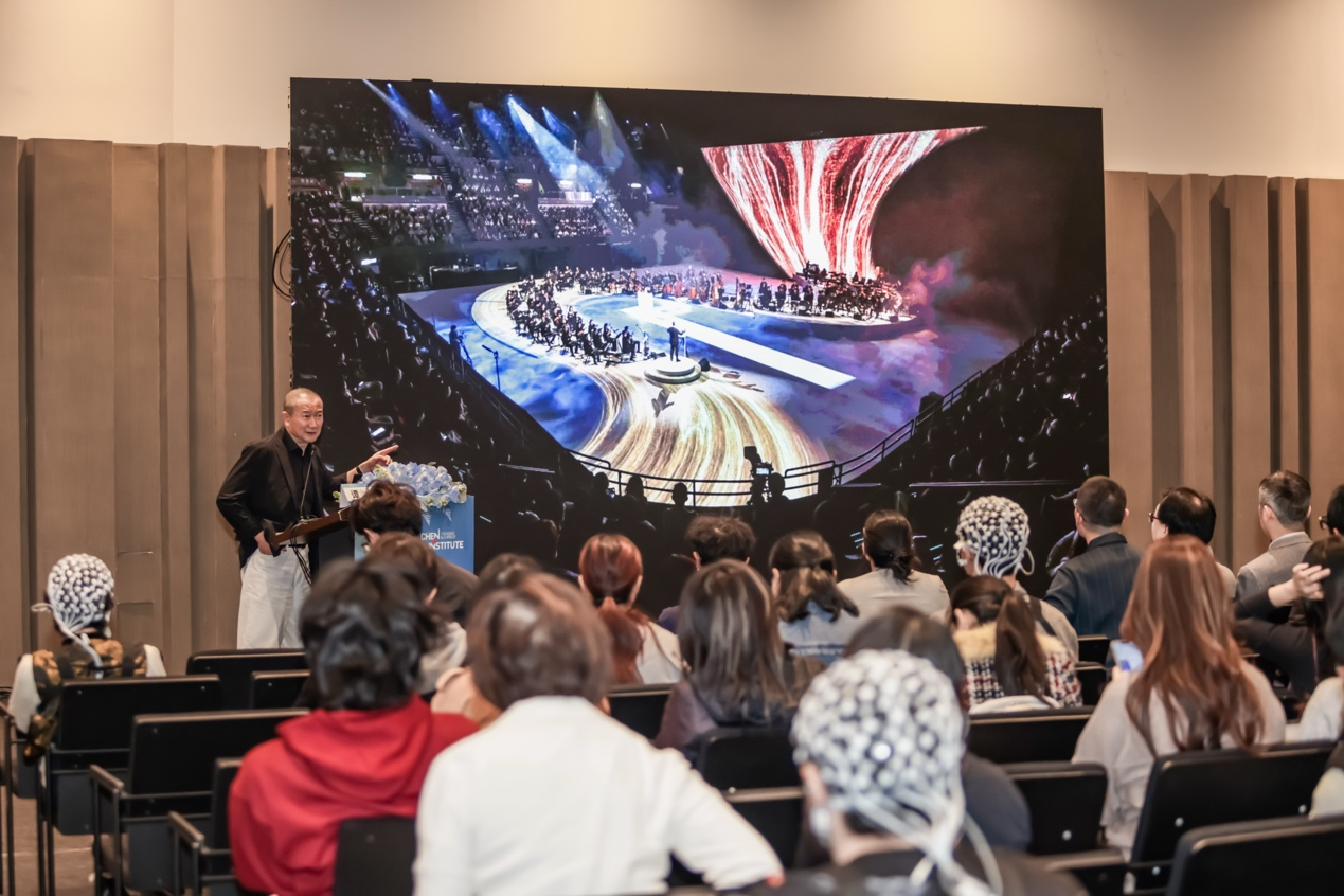 作曲家、指挥家,上海音乐学院教授、博士生导师谭盾以《听觉视野与声音科技》为题,为与会者带来了一场充满哲学思辨与艺术想象力的演讲。他以“左耳朵听西方,右耳朵听东方”的个人体验为引,生动阐述了其创作中东西方文化的交融与碰撞。从嵇康的《声无哀乐论》到他在上海朱家角水乐堂听到的巴赫与禅宗早课的共鸣,谭盾教授强调,听觉不仅是生理感知,更是一种“修行”。