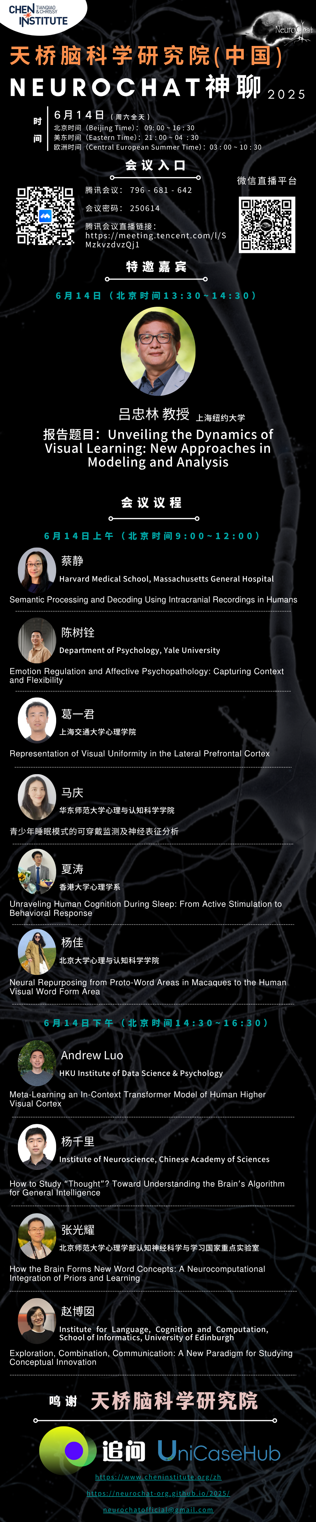 本次会议特邀美国实验心理学会高级会士、上海纽约大学神经科学教授吕忠林作《揭示视觉学习动态:建模与分析的新方法》主题报告。会议涵盖视觉学习动态机制、语义处理与解码技术、情绪调节的神经基础等热点议题,还重点关注了颅内记录技术在人类认知研究中的应用,以及睡眠状态下的认知过程解析,展现了从基础神经机制到临床应用的完整研究链条。